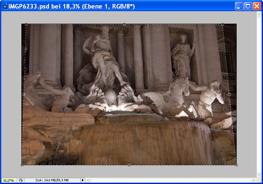 Als Beispiel ein Foto, das aus freier Hand spät am Abend am Fontana di Trevi in Rom entstand. Die vorangehenden Arbeitsschritte werden auf den folgenden Webseiten beschrieben: